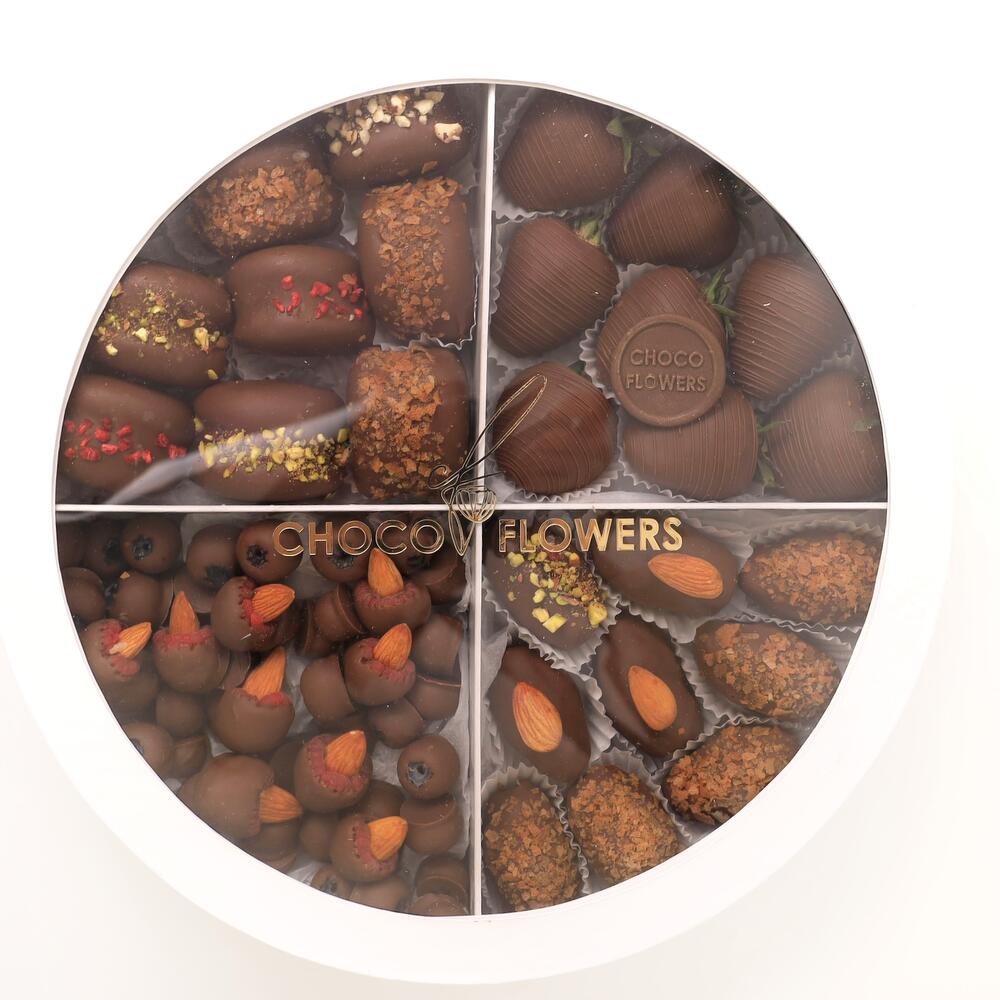 Цилиндр с 4 отсеками: Макароны в молочном шоколаде: 7-9 шт Финики в молочном шоколаде: 7-9 шт Клубника в молочном шоколаде: 7-9 шт Голубика в шоколаде: 180 гр Малина в шоколаде: 45 Гр