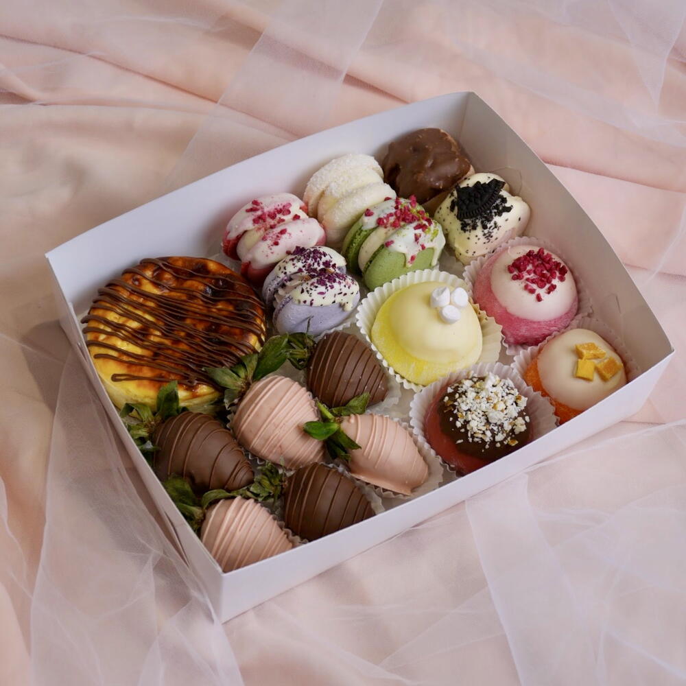 В наборе 1 шт испанский чизкейк 6 шт макаронс 6 шт клубники в шоколаде 4 шт Моти в шоколадном оформлении
