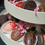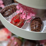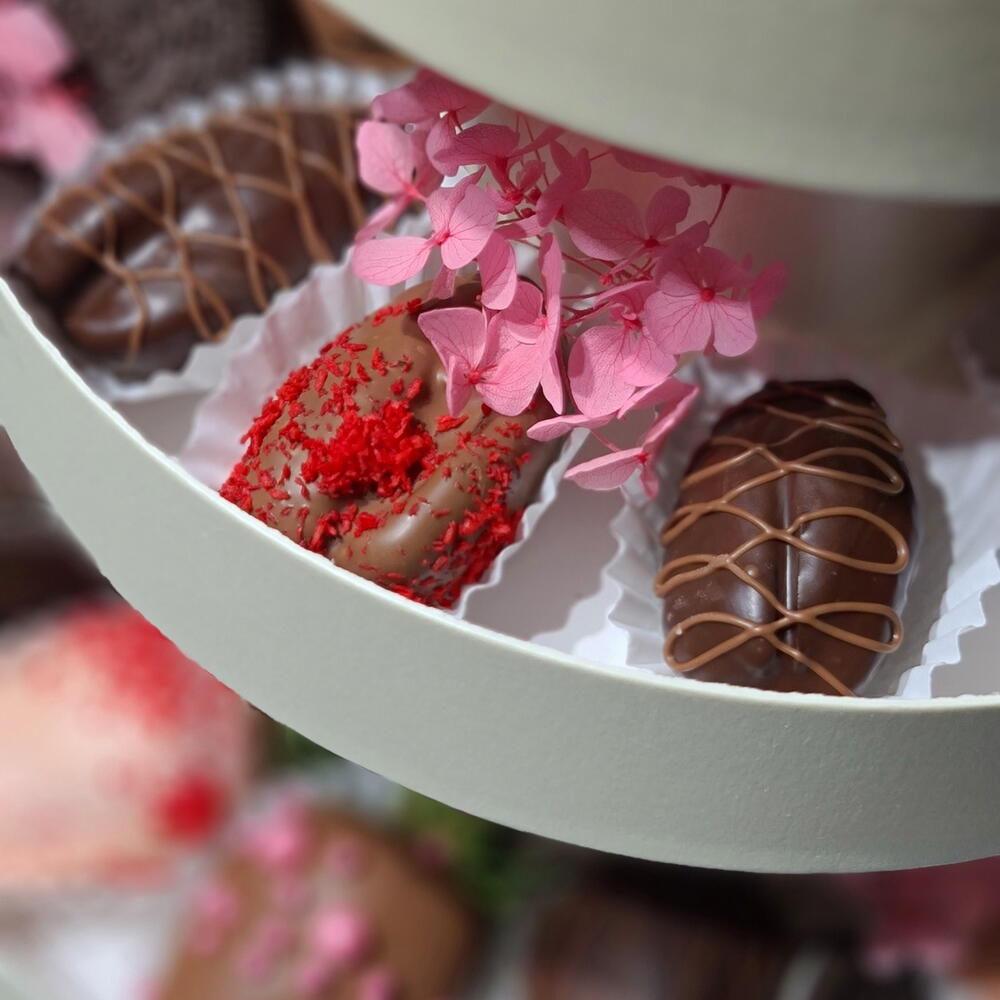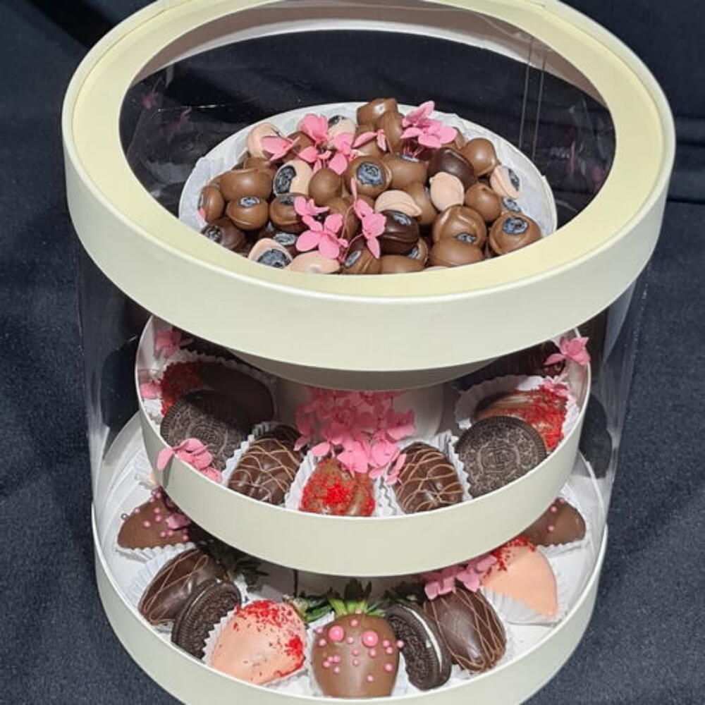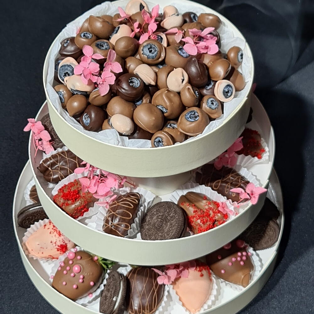 Великолепная этажерка с шикарным наполнением. Освежающая голубика в бельгийском молочном шоколаде Callebaut , голубика в темном бельгийском шоколаде Callebaut. Королевские финики с грецким орехом внутри в молочном и тёмном бельгийском шоколаде Callebaut,украшенные кокосовой стружкой. Клубника в молочном, тёмном, розовом бельгийском шоколаде Callebaut, украшенная кокосовой стружкой и воздушным рисом. В дополнение- печенье Орео. Сублимированная гортензия дополняет композицию.