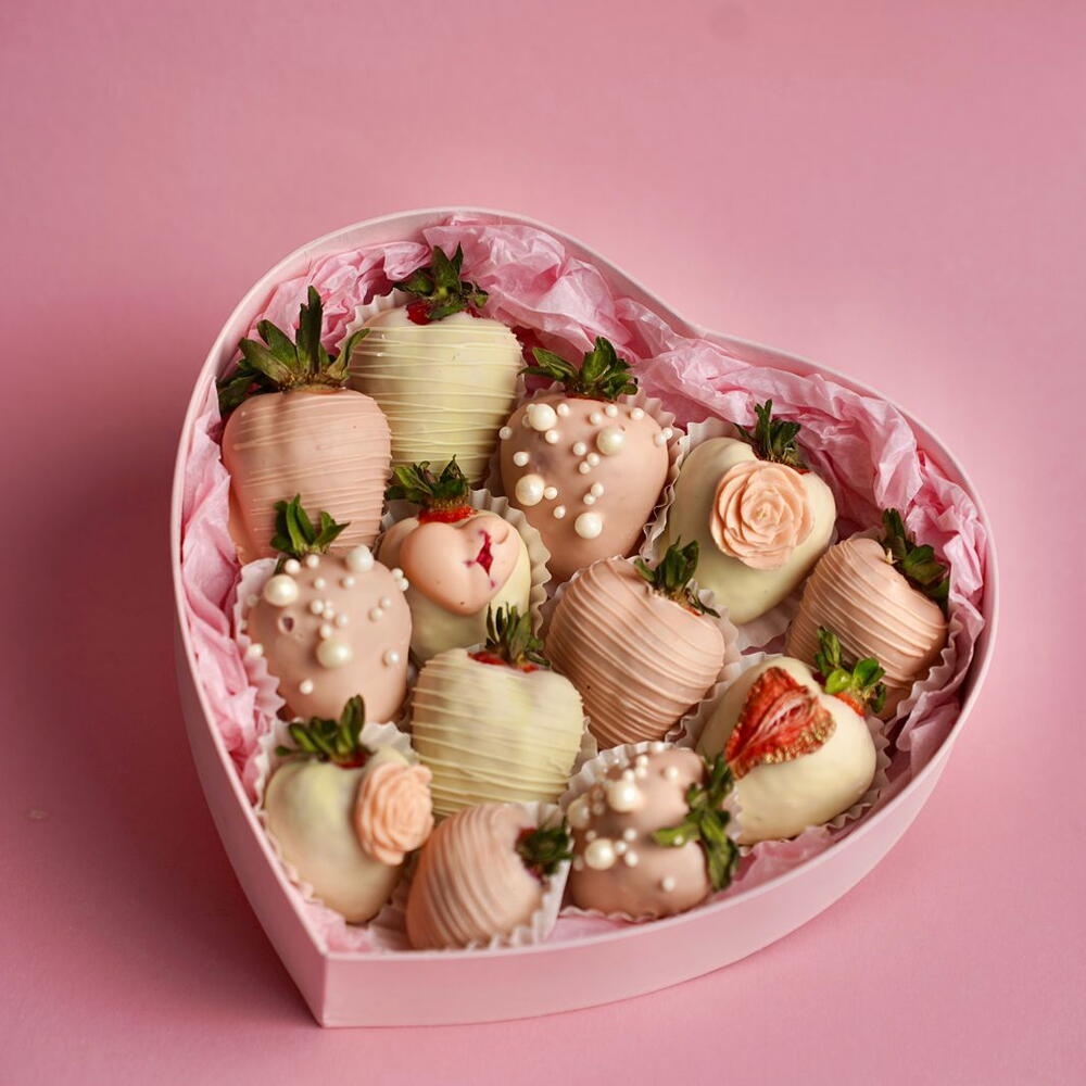 Состав: отборная клубника, бельгийский белый и розовый шоколад, сублимированная клубника, съедобный жемчуг. Состав шоколада: какао масло, сухое молоко и Сахар.