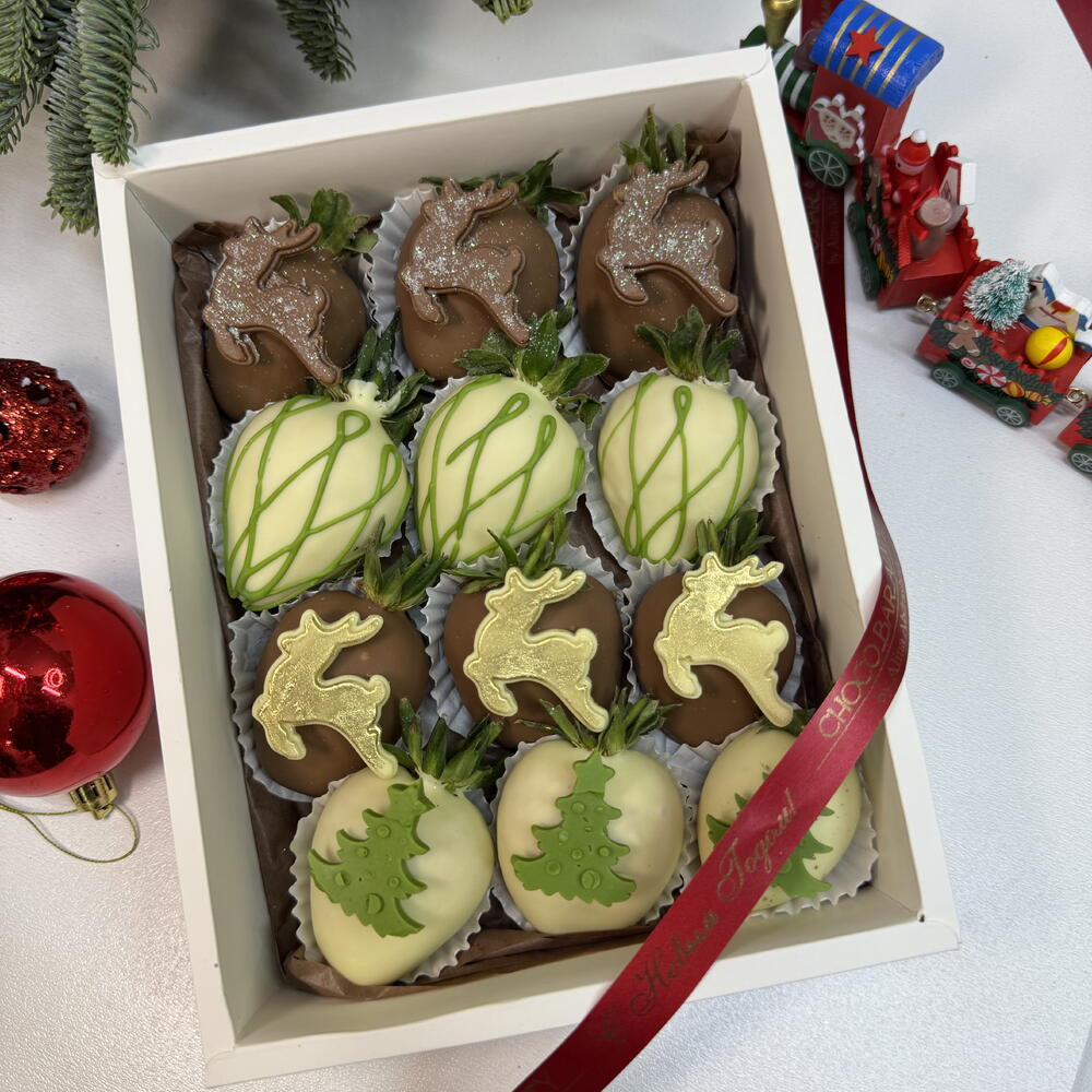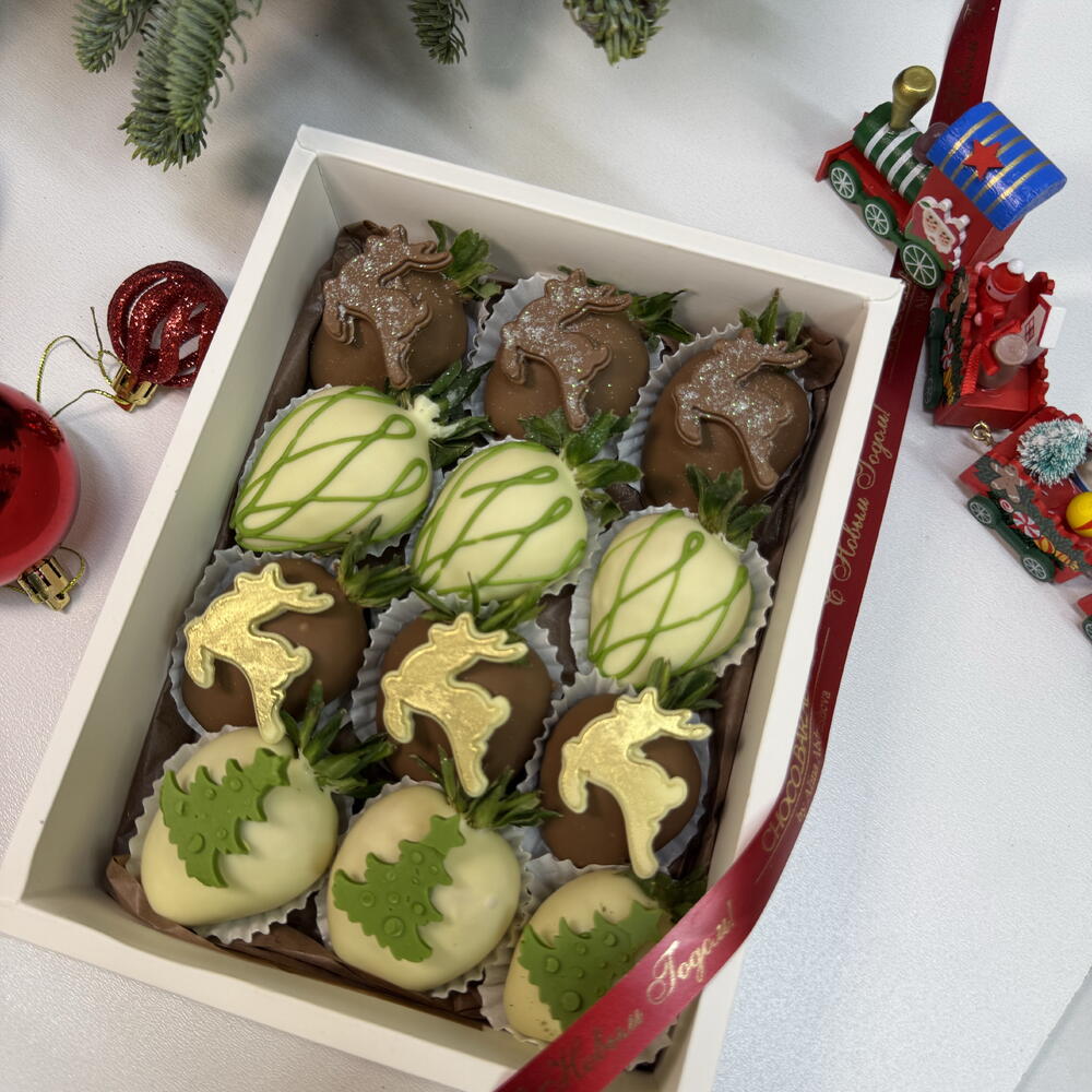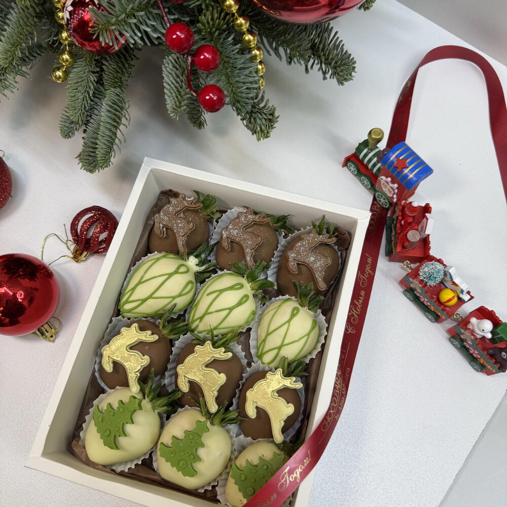 Праздничный набор из отборной свежей клубники, покрытой настоящим бельгийским молочным и белым шоколадом. Каждая ягода украшена новогодним декором из шоколада: олени, ёлочки и изящные узоры, подчёркнутые благородными золотыми и зелёными акцентами. Идеальный баланс вкуса и эстетики: нежный шоколад, сочная клубника и ручная работа в каждой детали. Бокс собран в стильной коробке и дополнен фирменной лентой — готовый подарок без лишних слов. Идеально подойдёт для новогоднего поздравления, корпоративного подарка или тёплого знака внимания