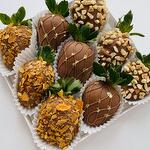 Яркий подарок — клубника, покрытая тонким слоем молочного шоколада, украшенная дроблёными орехами, вафельной крошкой и золотой поталью. Каждая ягода размещена в индивидуальной бумажной капсуле. Идеально для праздничного чаепития, романтического ужина или комплимента.