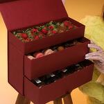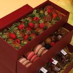 Коробка состоит из трех отсеков. 1 отсек - Клубника в молочном шоколаде 21 шт 2 отсек - пирожные макарон, шоколад ручной работы, трюфель, медианты с ягодами 3 отсек - 3 баночки с шоколадом ручной работы В дополнении используются посыпки: кандурин, вафельная крошка