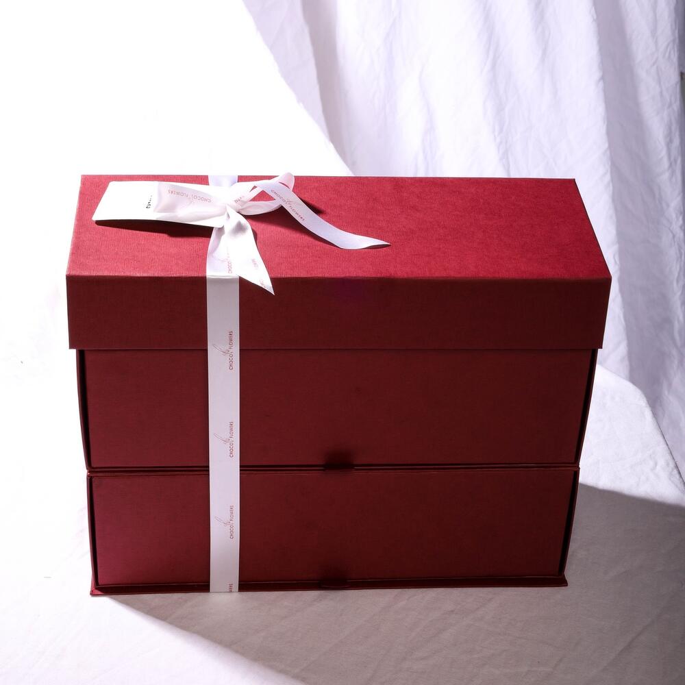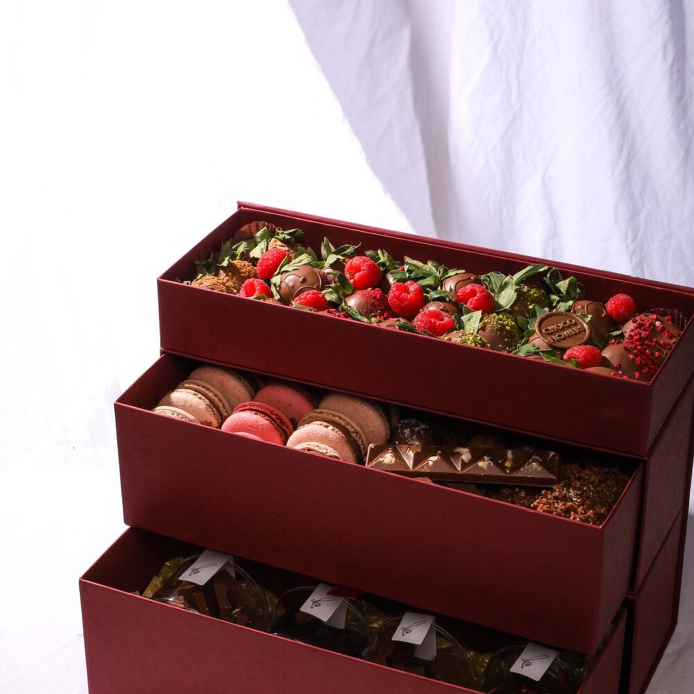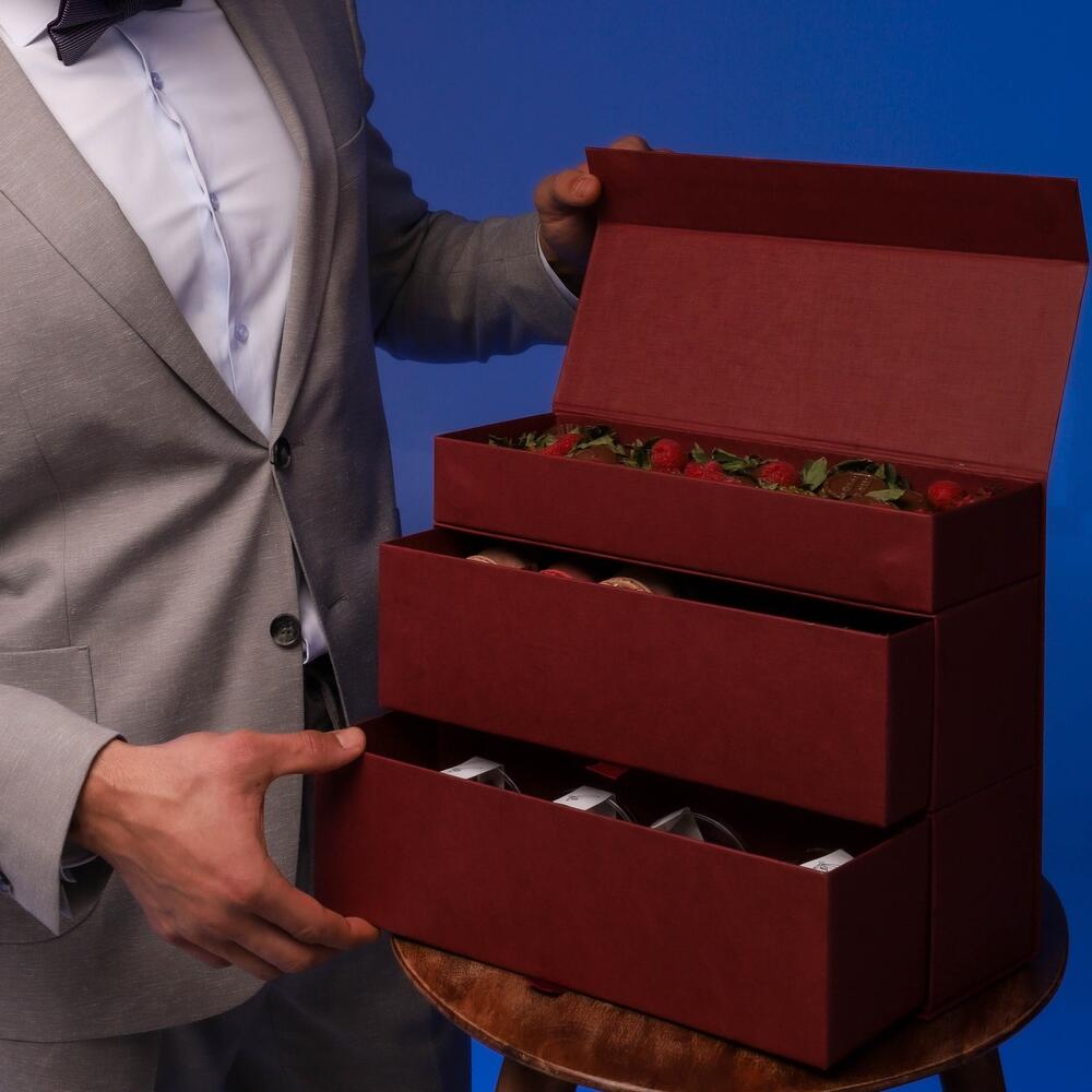 Коробка состоит из трех отсеков. 1 отсек - Клубника в молочном шоколаде 21 шт 2 отсек - пирожные макарон, шоколад ручной работы, трюфель, медианты с ягодами 3 отсек - 3 баночки с шоколадом ручной работы В дополнении используются посыпки: кандурин, вафельная крошка