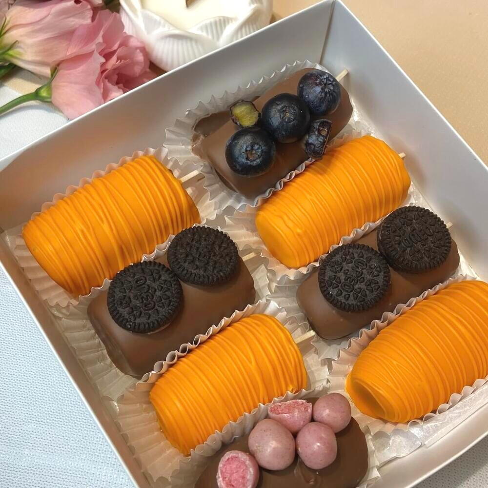 Набор из 6 шоколадных мини-десертов на палочке. Состав мини-десерта: • Молочный шоколад (основа всех десертов) • Начинка может быть: бисквит, крем, суфле, орехи, ягодный или фруктовый джем (уточняется индивидуально). • Декор: – Яркая желтая кондитерская глазурь – OREO мини-печенье – Сублимированные ягоды (клубника, голубика) – Орехи (фисташки)