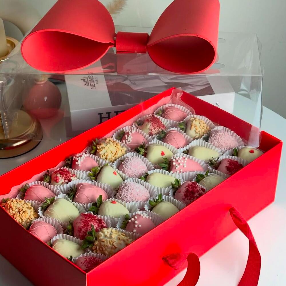 Сет из 32 клубник в шоколаде в стильной коробке с красным бантом Роскошный набор из 32 сочных клубник, покрытых нежным халяль-шоколадом, — это идеальное воплощение элегантности и вкуса. Каждая ягода аккуратно украшена, создавая гармонию красоты и изысканности. Набор представлен в стильной подарочной коробке, украшенной ярким красным бантом, который добавляет шарм и делает ваш подарок по-настоящему особенным. Этот сет станет прекрасным выбором для любого случая: от признания в чувствах до праздничного комплимента. Он не только удивит своим внешним видом, но и подарит наслаждение в каждом кусочке. Varda — искусство дарить радость от сердца к сердцу.