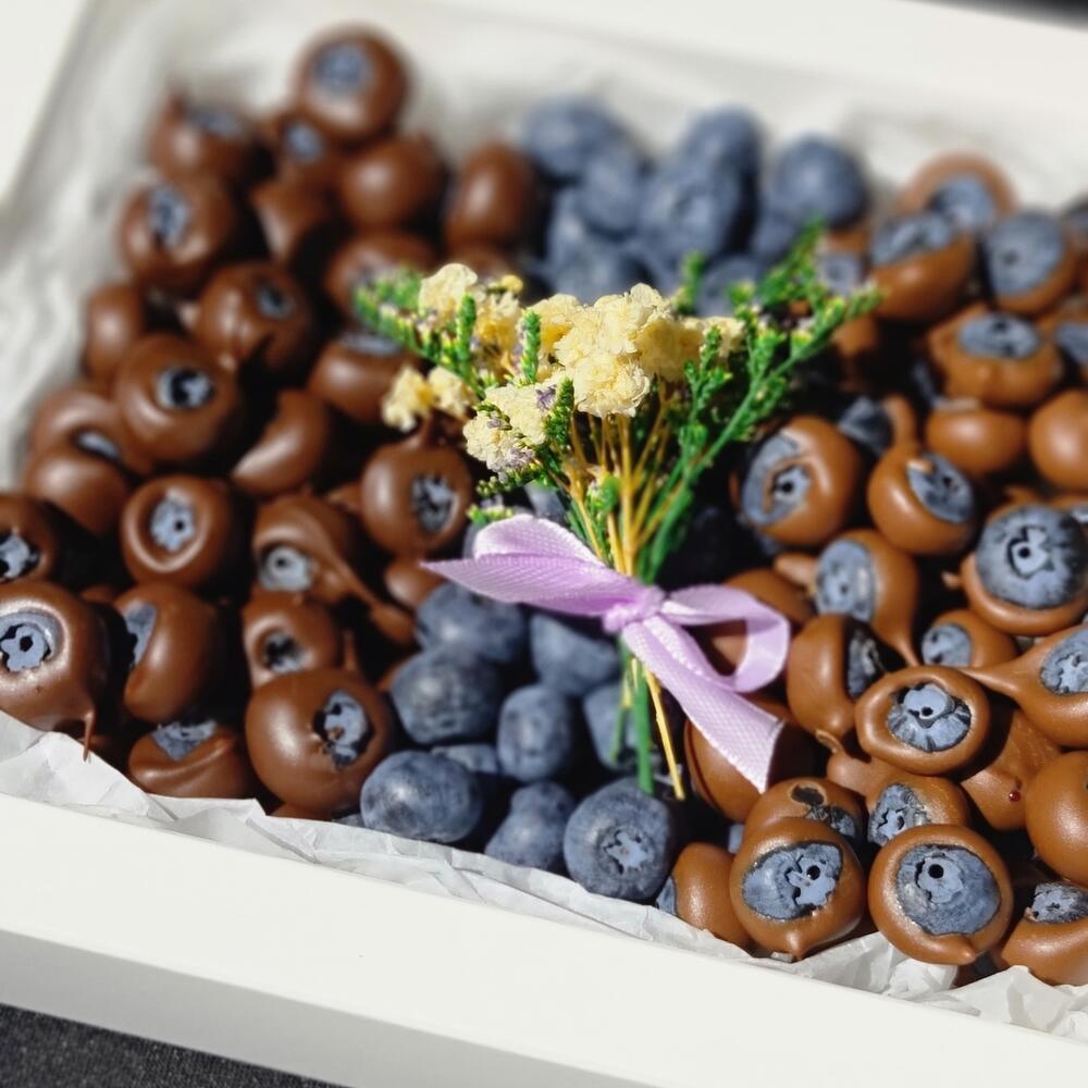 Голубика, Голубика в молочном шоколаде, голубика в тёмном шоколаде, мини-букетик из гипсофилы