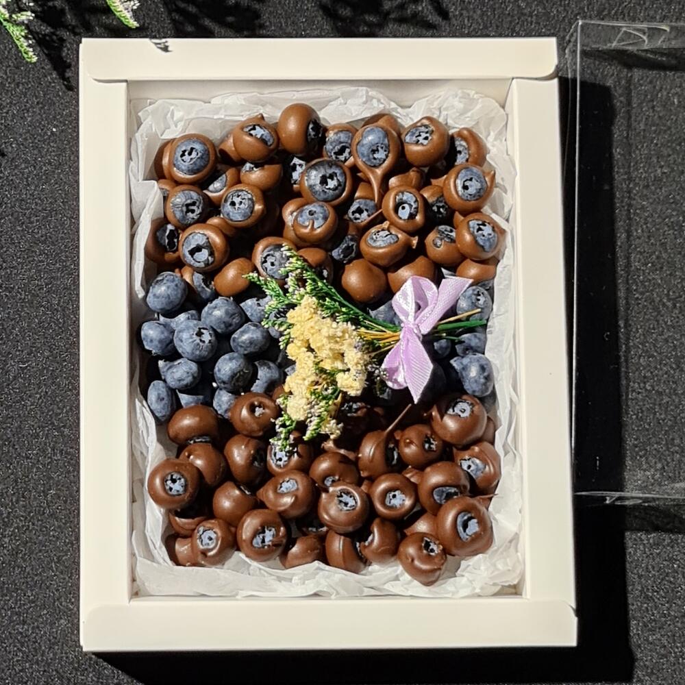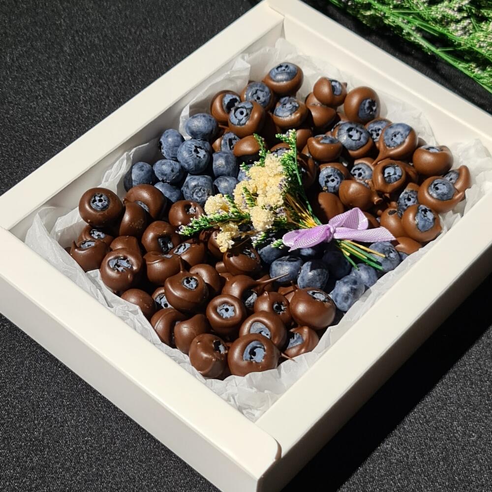 Голубика- любимица взрослых и детей! В наборе голубика, голубика в бельгийском тёмном и молочном шоколаде. Украшает композицию миниатюрный букетик из гипсофилы, который ещё долгое время будет напоминать о подарке. Дарите настроение родным и любимым, романтика никогда не выйдет из моды😉