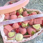 • Клубника в шоколаде Callebaut (розовом и белом) • Свежая малина и сушеное киви • Мини-шоколадные плитки Callebaut и шоколадные розы (розовые) Состав шоколада Callebaut: • Белый шоколад Callebaut: сахар, какао-масло, сухое молоко, лактоза, эмульгатор лецитин, натуральная ваниль • Клубничный шоколад Ruby или клубничная глазурь Callebaut: сахар, какао-масло, сухое молоко, концентрированное клубничное пюре/порошок, эмульгатор лецитин, натуральные ароматизаторы, натуральный краситель (от клубники или рубиновый)