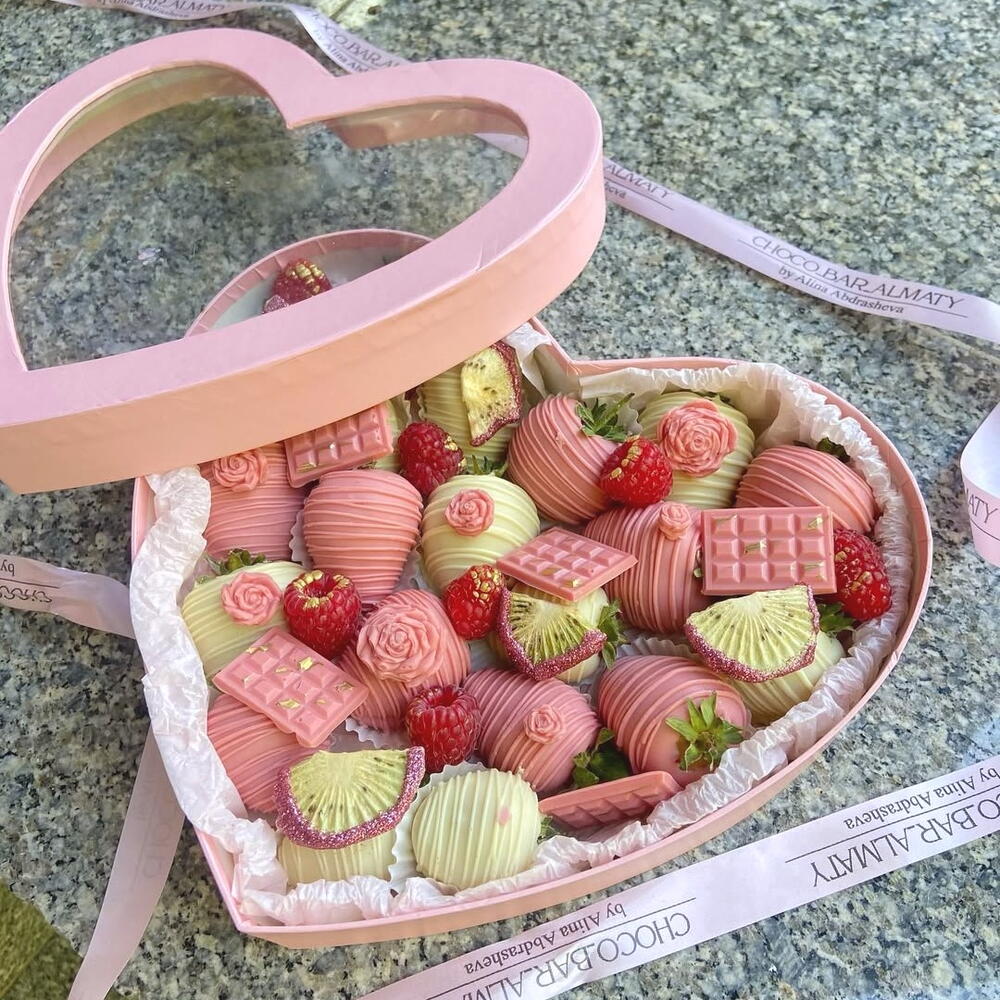 Роскошная подарочная коробка в форме сердца с клубникой в шоколаде — воплощение нежности и изящества 💕🍓. Внутри — свежая клубника, покрытая клубничным и белым шоколадом, украшенная декоративными элементами: мини-плитками шоколада, хрустящими ломтиками киви в сахарной пудре, ягодами малины и шоколадными розами ручной работы. Цветовая палитра — мягкие пастельные розовые и кремовые тона, создающие атмосферу романтики и утончённости. Такой набор идеально подойдёт для подарка на День Святого Валентина, 8 Марта, день рождения или просто для того, чтобы порадовать близкого человека. Хранить при температуре от +2 до +6°C, избегая прямых солнечных лучей. Для максимального раскрытия вкуса достаньте за 10–15 минут до подачи.