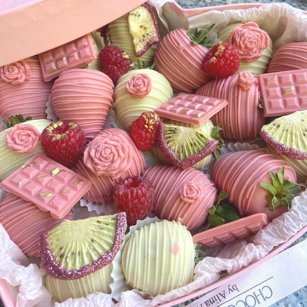 • Клубника в шоколаде Callebaut (розовом и белом) • Свежая малина и сушеное киви • Мини-шоколадные плитки Callebaut и шоколадные розы (розовые) Состав шоколада Callebaut: • Белый шоколад Callebaut: сахар, какао-масло, сухое молоко, лактоза, эмульгатор лецитин, натуральная ваниль • Клубничный шоколад Ruby или клубничная глазурь Callebaut: сахар, какао-масло, сухое молоко, концентрированное клубничное пюре/порошок, эмульгатор лецитин, натуральные ароматизаторы, натуральный краситель (от клубники или рубиновый)