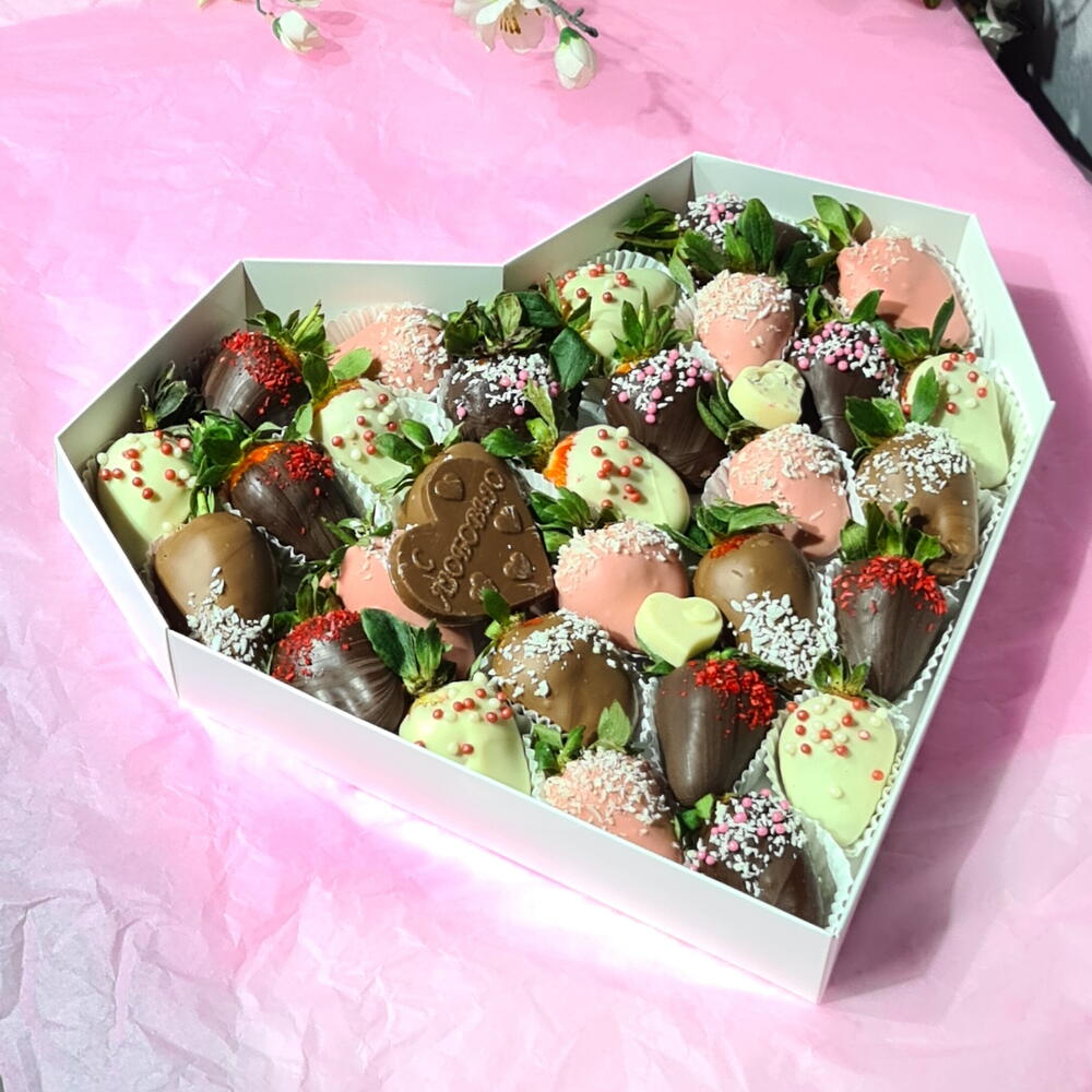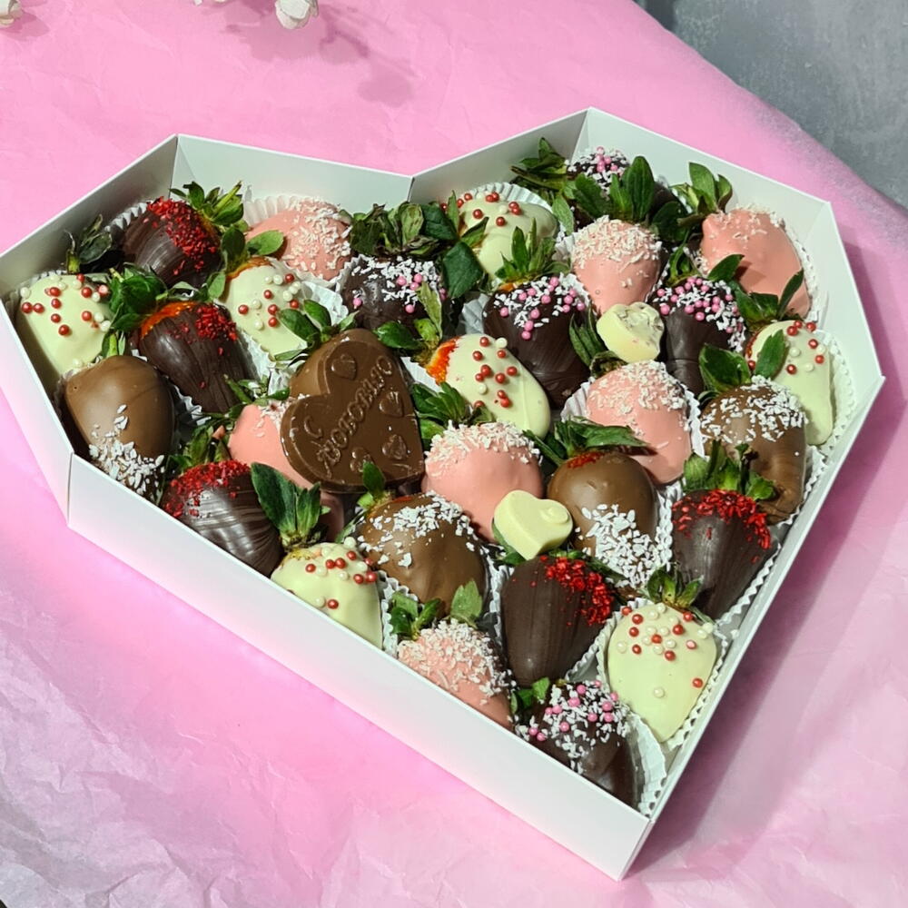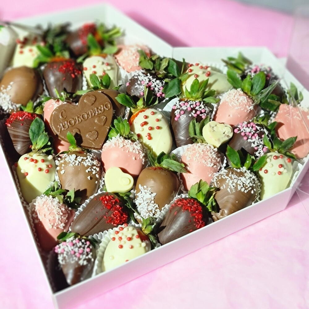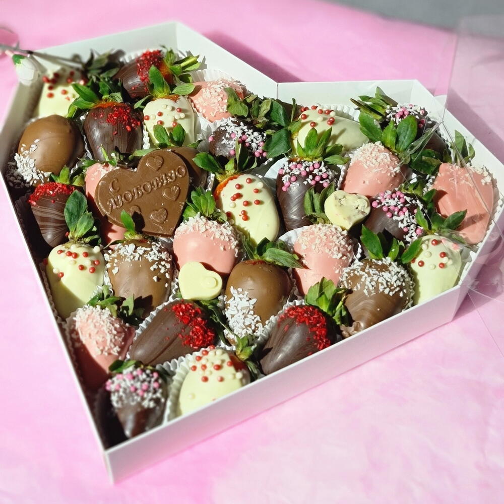 Набор клубники в бельгийском шоколаде в размере L Шоколадная открытка в виде сердца с надписью С любовью - в подарок Дарите любимым вкусные моменты не дожидаясь особого повода!