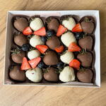 Классическое сочетание свежей клубники в бельгийском молочном и белом шоколаде. Идеальный подарок на любой случай - стильный, вкусный и собранный с заботой. Украшен свежими ягодами клубники и голубикой