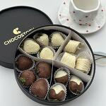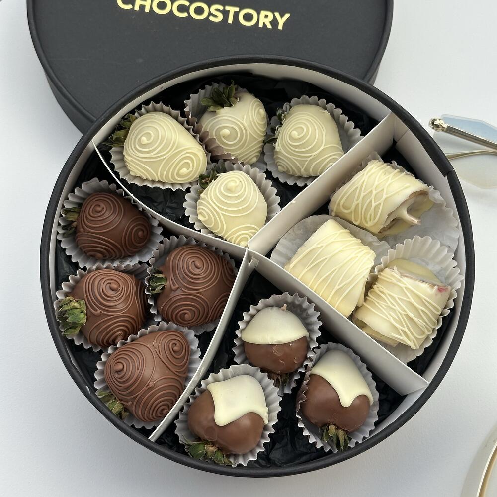 11 клубники в бельгийском шоколаде 3 бананов в бельгийском шоколаде Коробка Клубника свежая - 11 шт. • Шоколад бельгийский (молочный, белый) • Молочный шоколад: сахар, какао-масло, сухое молоко, какао тёртое, лецитин (эмульгатор), ванилин. • Белый шоколад: сахар, какао-масло, сухое молоко, лецитин (эмульгатор), ванилин.