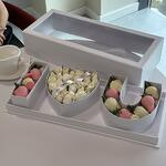 • Клубника свежая – 10 шт. • Шоколад бельгийский (белый, розовый) • Белый шоколад: сахар, какао-масло, сухое молоко, лецитин (эмульгатор), ванилин. • Розовый шоколад (Ruby): сахар, какао-масло, сухое молоко, какао-бобы Ruby, лимонная кислота, лецитин (эмульгатор), ванилин. Также есть мини шоколадки • Общий вес: примерно 1200 г.