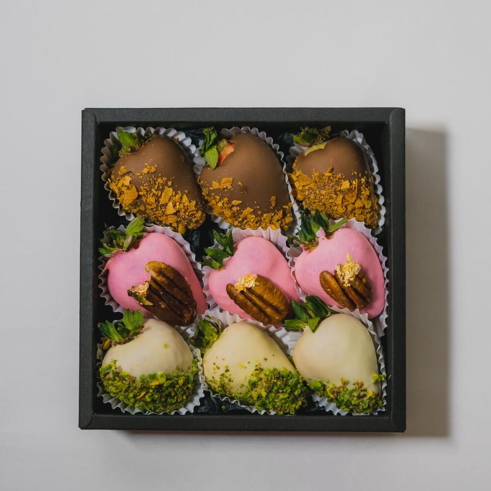 Набор из 9 крупных клубник, украшенный орехами пекан, дроблеными фисташками и вафельными крошками