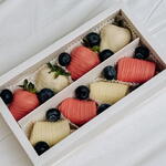 Небольшой аккуратный набор с клубникой и бананами, покрытыми бельгийским белым и Ruby-шоколадом Callebaut. Украшен свежей голубикой. Идеальный вариант для небольшого подарка или приятного сладкого комплимента.