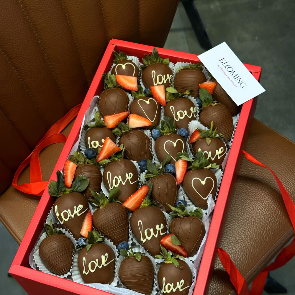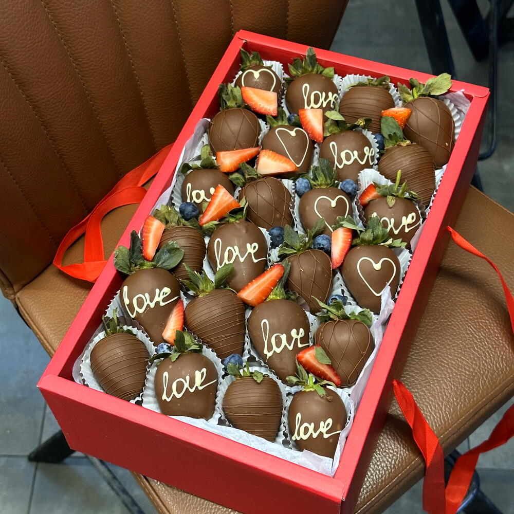 Отборная свежая клубника • Бельгийский молочный шоколад Callebaut (в составе: сахар, масло какао, сухое молоко, какао масса, эмульгатор — соевый лецитин, натуральный ванильный ароматизатор) • Украшение из свежей клубники и голубики • Декор из белого бельгийского шоколада Callebaut (в составе: сахар, масло какао, сухое молоко, эмульгатор — соевый лецитин, натуральный ванильный ароматизатор)