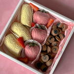 Изысканный сет из свежей клубники в бельгийском шоколаде с нежным узором и конфетами ручной работы с ягодами внутри. Лёгкий ягодный декор придаёт свежесть и сочность. Отличный выбор для подарка или личного удовольствия.