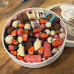 — Клубника в бельгийском шоколаде (белый, молочный, розовый) – около 20 шт — Бананы в бельгийском шоколаде – 5 шт — Макароны — 5 шт (разные вкусы) — голубика в белом и молочном шоколаде — около 15 шт — Свежая клубника и голубика для украшения Состав молочного шоколада Callebaut: Сахар, масло какао, сухое молоко, какао масса, эмульгатор (соевый лецитин), натуральный ароматизатор ванили Состав белого шоколада Callebaut: Сахар, масло какао, сухое молоко, эмульгатор (соевый лецитин), натуральный ароматизатор ванили