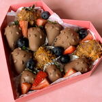 Клубничный сет в форме сердца. Сочетание свежей клубники в бельгийском молочном шоколаде с хрустящим декором из хлопьев и орешков. Лёгкое украшение ягодами клубники и черники придаёт свежесть и праздничное настроение. Идеальный комплимент или подарок для любимых. Каждый сет собирается вручную из свежих ингредиентов, возможны незначительные отличия по оформлению.