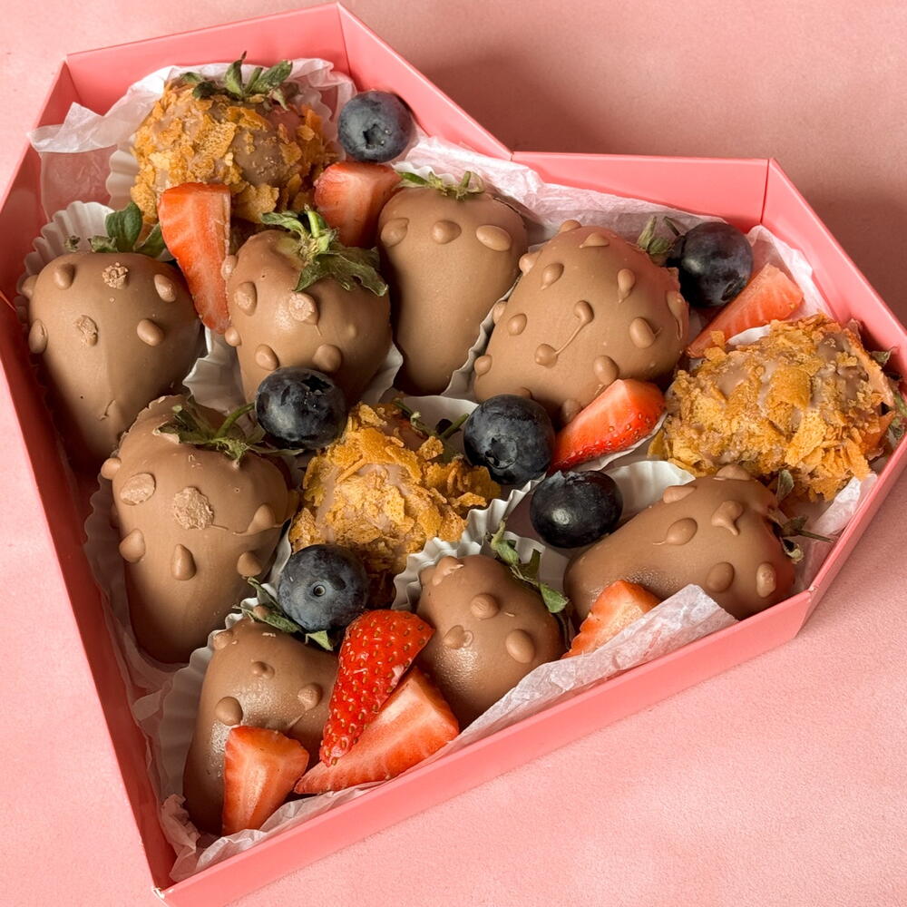 Клубничный сет в форме сердца. Сочетание свежей клубники в бельгийском молочном шоколаде с хрустящим декором из хлопьев и орешков. Лёгкое украшение ягодами клубники и черники придаёт свежесть и праздничное настроение. Идеальный комплимент или подарок для любимых. Каждый сет собирается вручную из свежих ингредиентов, возможны незначительные отличия по оформлению.