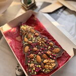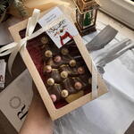 Бельгийский молочный шоколад: какао-масло, тертое какао, сухое цельное молоко, сахар, натуральные лецитин и ваниль Сублимированная малина Фундук Миндаль Грецкий орех Фисташка Арахис