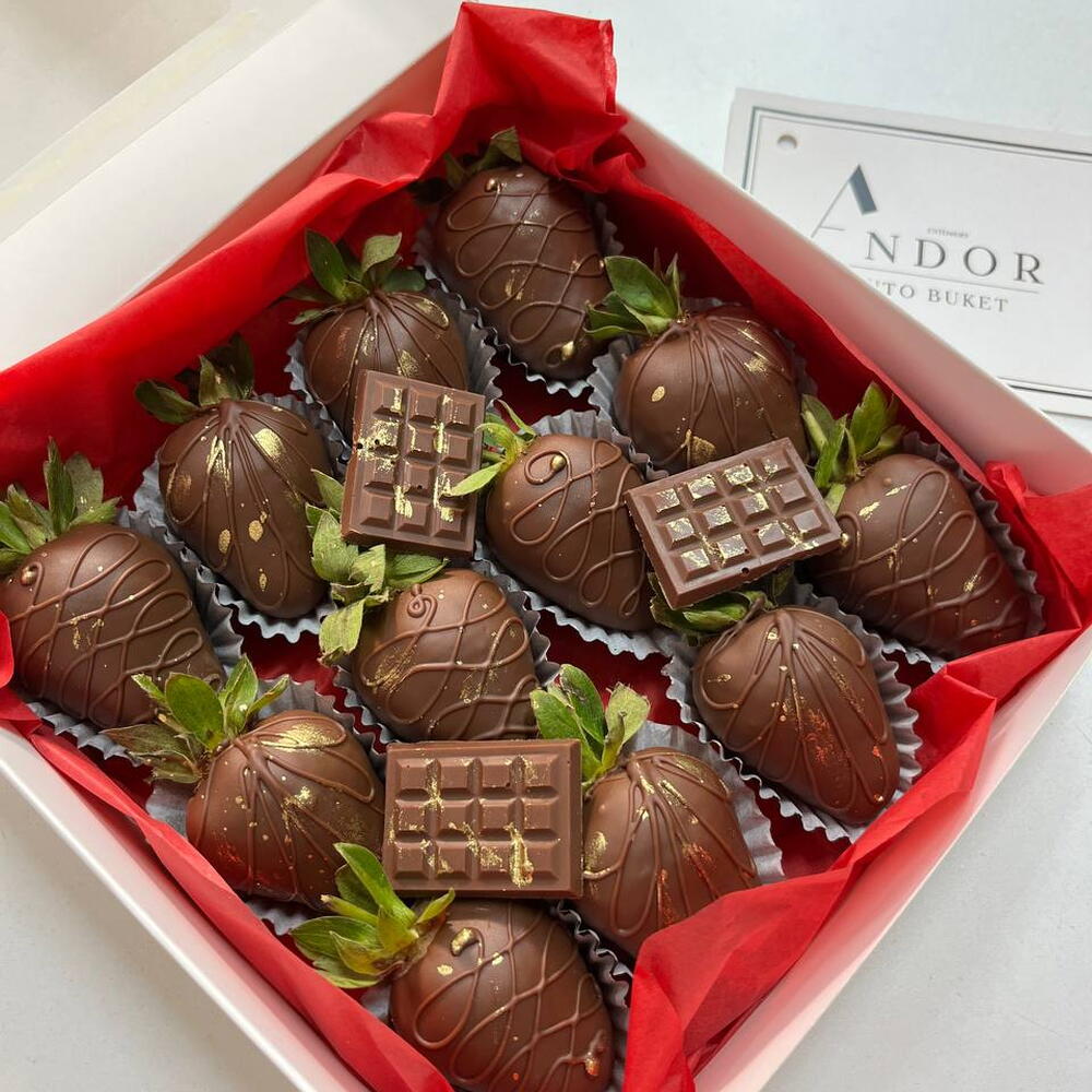 1. Клубника свежая 2. Шоколад: • Молочный шоколад: Сахар, какао-масло, какао тертое, сухое молоко, сухая сыворотка, эмульгатор (лецитин), ванилин.