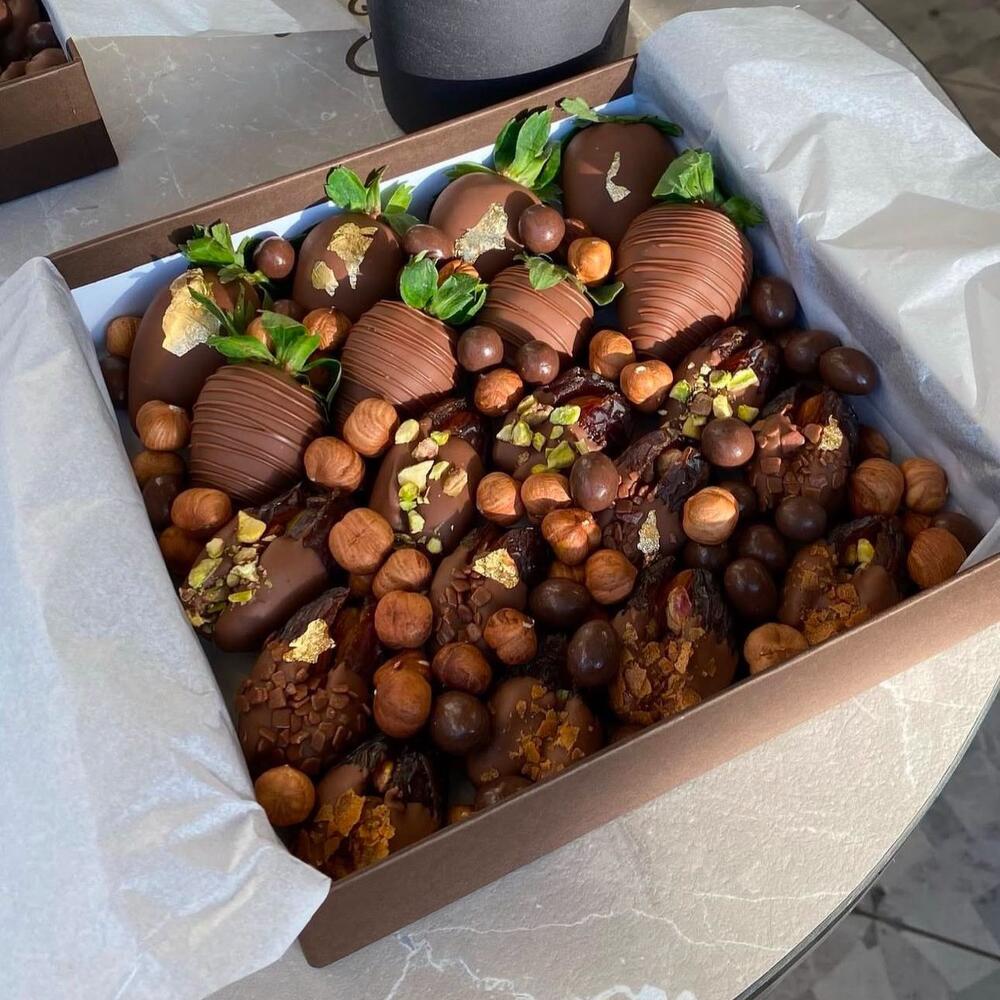 Сет из отборных клубник, королевских фиников и фундука Изысканный набор для настоящих гурманов! Сет объединяет сочные отборные клубники, сладкие королевские финики и хрустящий фундук, покрытые премиальным халяль бельгийским шоколадом. Идеальное сочетание вкусов: нежная сладость, насыщенные ореховые нотки и свежесть ягод. Этот сет станет прекрасным выбором для подарка, комплимента или особенного угощения. Каждая деталь набора создана с заботой о вашем удовольствии. Varda — вкус, который вдохновляет и объединяет сердца. ❤️