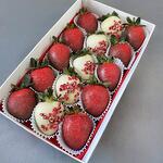 Состав: свежая клубника в молочном шоколаде с добавками из сублимированной малины дополнительной посыпкой.