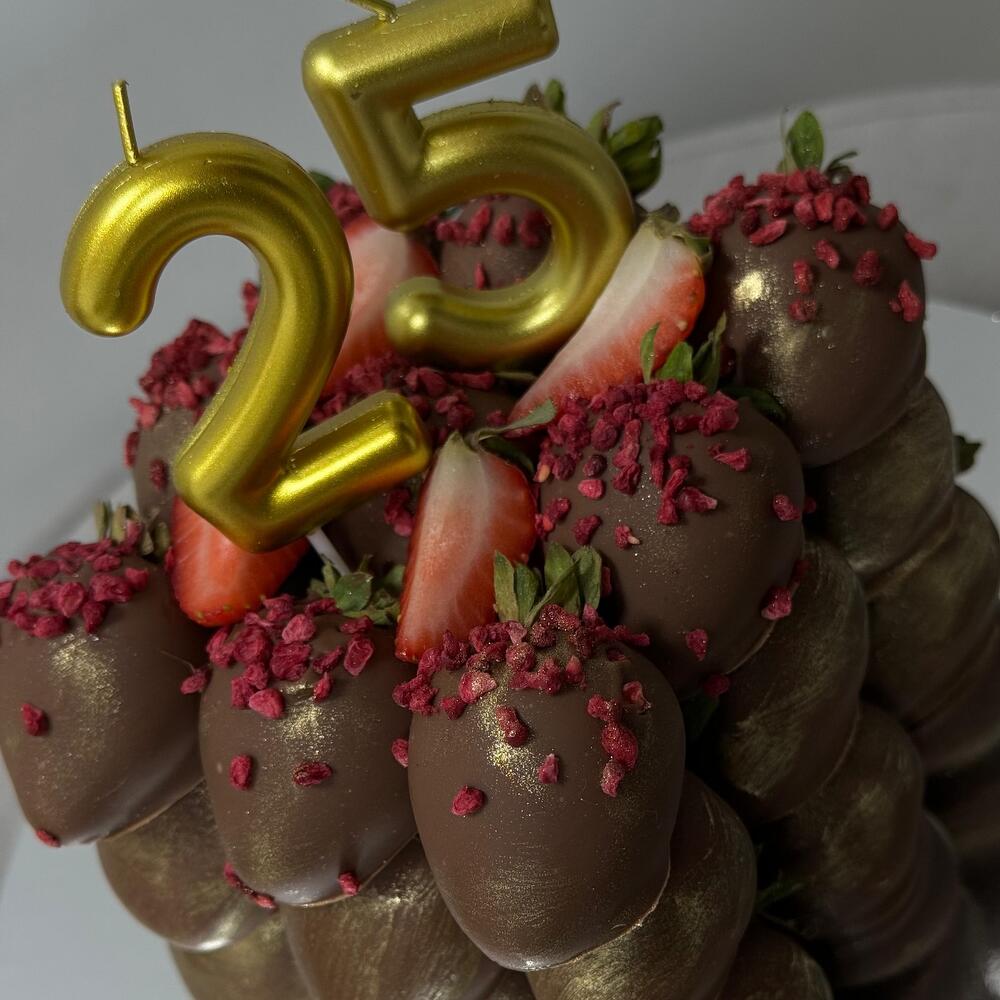 Торт из клубники в молочном шоколаде callebaut, с сублимированной малиной, свечки на выбор