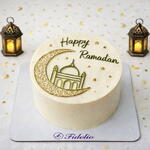 Нежный праздничный торт в изысканном минималистичном оформлении, украшенный золотым полумесяцем, мечетью и надписью. Идеальный десерт для ифтара, семейного ужина и подарка в священный месяц Рамадан. Стильный, аккуратный и торжественный — станет украшением праздничного стола.