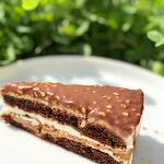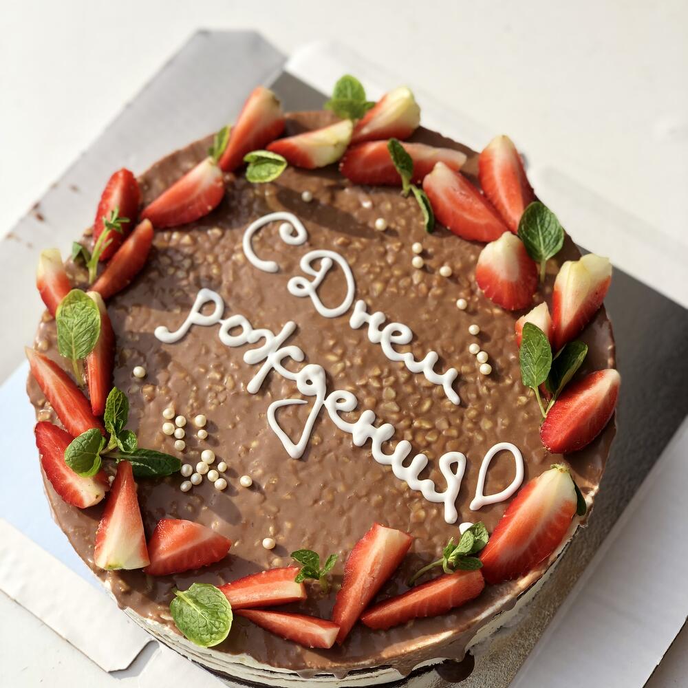 Сникерс-насыщенный сытный и богатый вкус. Нежно воздушный бисквит, прослойка из сливочного крема,с начинкой из карамели и жаренного арахиса. Сверху полит молочным шоколадом. Оформлен свежой клубникой.