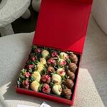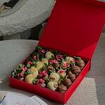 Клубника в молочном шоколаде Callebaut 15 шт. Клубника в белом шоколаде 10 шт., сахарная посыпка, сублимированные кусочки малины 3-4 мм, сублимированная клюква. Состав шоколада: какао-бобы, какао-масло, сахар, молоко, лецитин, ароматизаторы.