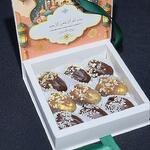 Королевские финики в молочном бельгийском шоколаде Callebaut тёмном бельгийском шоколаде Callebaut, начиненные грецким орехом и украшенные кокосовой стружкой и ореховой крошкой.