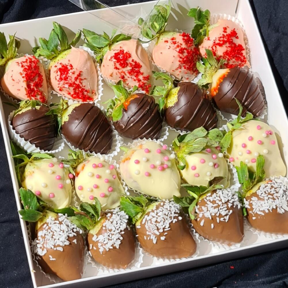 Клубника покрытая бельгийским белым и молочным шоколадом. Украшена кокосовой стружкой и воздушным рисом. Упакована в картонную коробку с крышкой из прозрачного пластика. К заказу можно оформить открытку с поздравлениями.