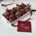 Набор из 8 сочных свежих клубничек, покрытых слоем высококачественного молочного шоколада, украшенных сублимированной малиной. Стильная подарочная коробка, лента и открытка — всё начинается с любви!