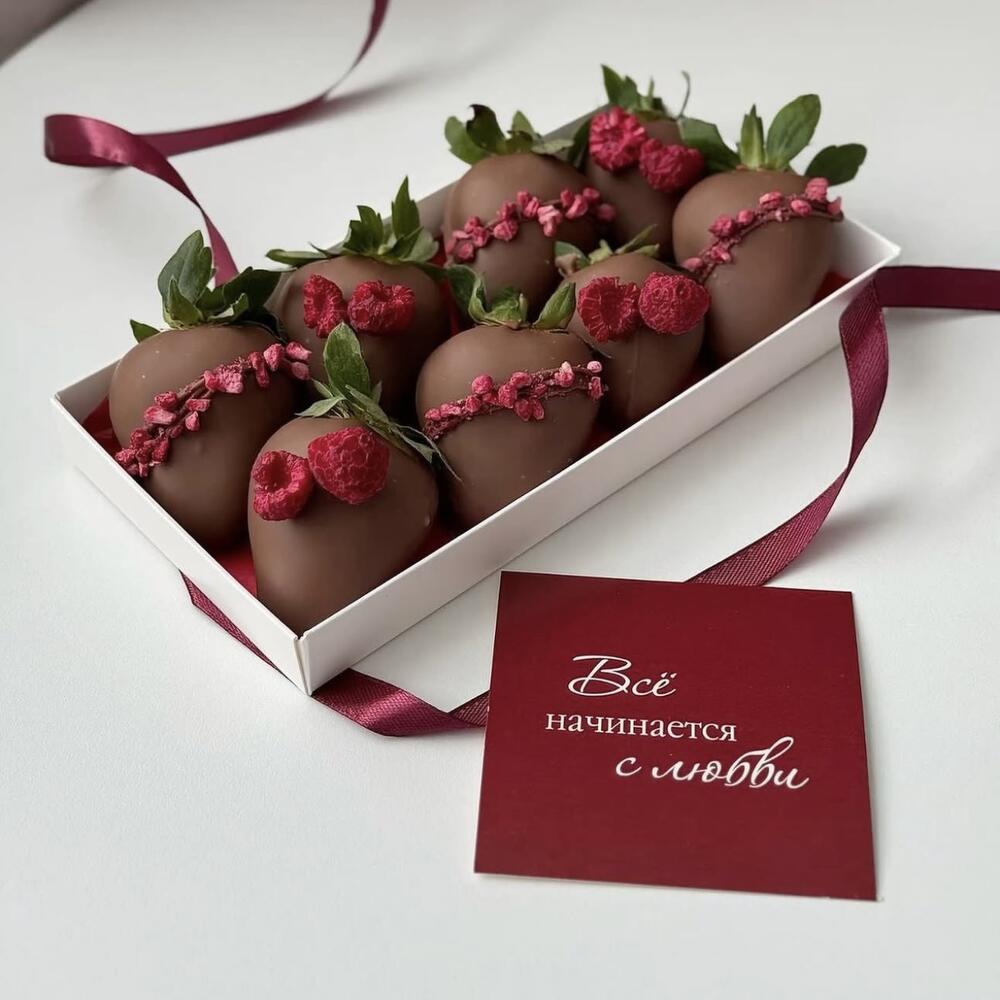 Набор из 8 сочных свежих клубничек, покрытых слоем высококачественного молочного шоколада, украшенных сублимированной малиной. Стильная подарочная коробка, лента и открытка — всё начинается с любви!
