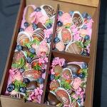 Клубника в молочном бельгийском шоколаде callebaut , украшенная рисовыми шариками и кокосовой стружкой. Клубника в тёмном бельгийском шоколаде callebaut. Клубника в розовом бельгийском шоколаде callebaut , украшенная рисовыми шариками .Свежая голубика. Сублимированная гортензия. Бокс из высококачественной фанеры. Открыточка с вашими пожеланиями.