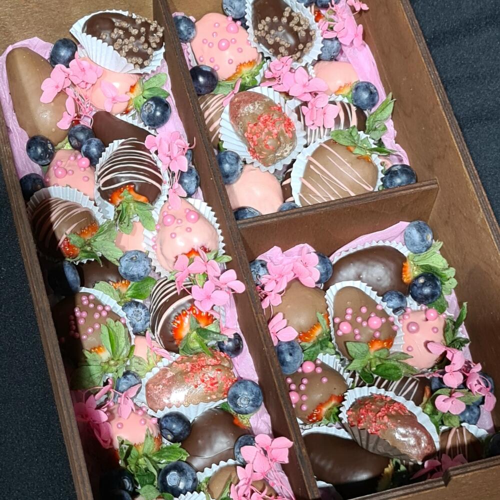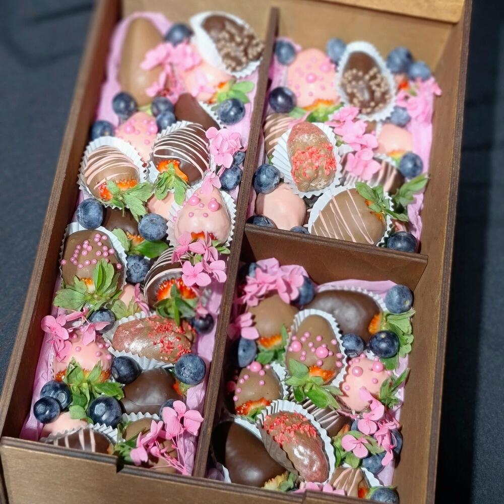 Клубника в молочном бельгийском шоколаде callebaut , украшенная рисовыми шариками и кокосовой стружкой. Клубника в тёмном бельгийском шоколаде callebaut. Клубника в розовом бельгийском шоколаде callebaut , украшенная рисовыми шариками .Свежая голубика. Сублимированная гортензия. Бокс из высококачественной фанеры. Открыточка с вашими пожеланиями.