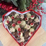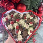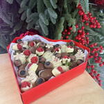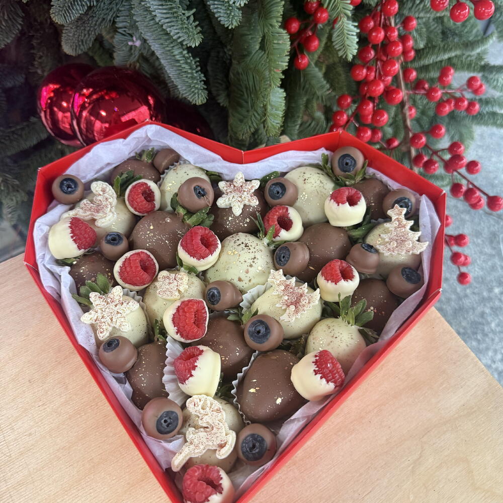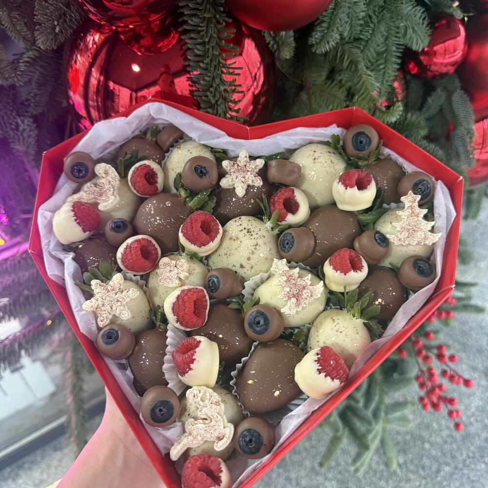Праздничная композиция из отборной свежей клубники, покрытой настоящим бельгийским шоколадом. В наборе — сочетание молочного и белого шоколада, клубника, малина и голубика , ягоды с изящным декором и новогодние элементы из белого шоколада.