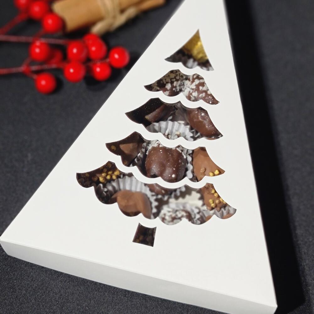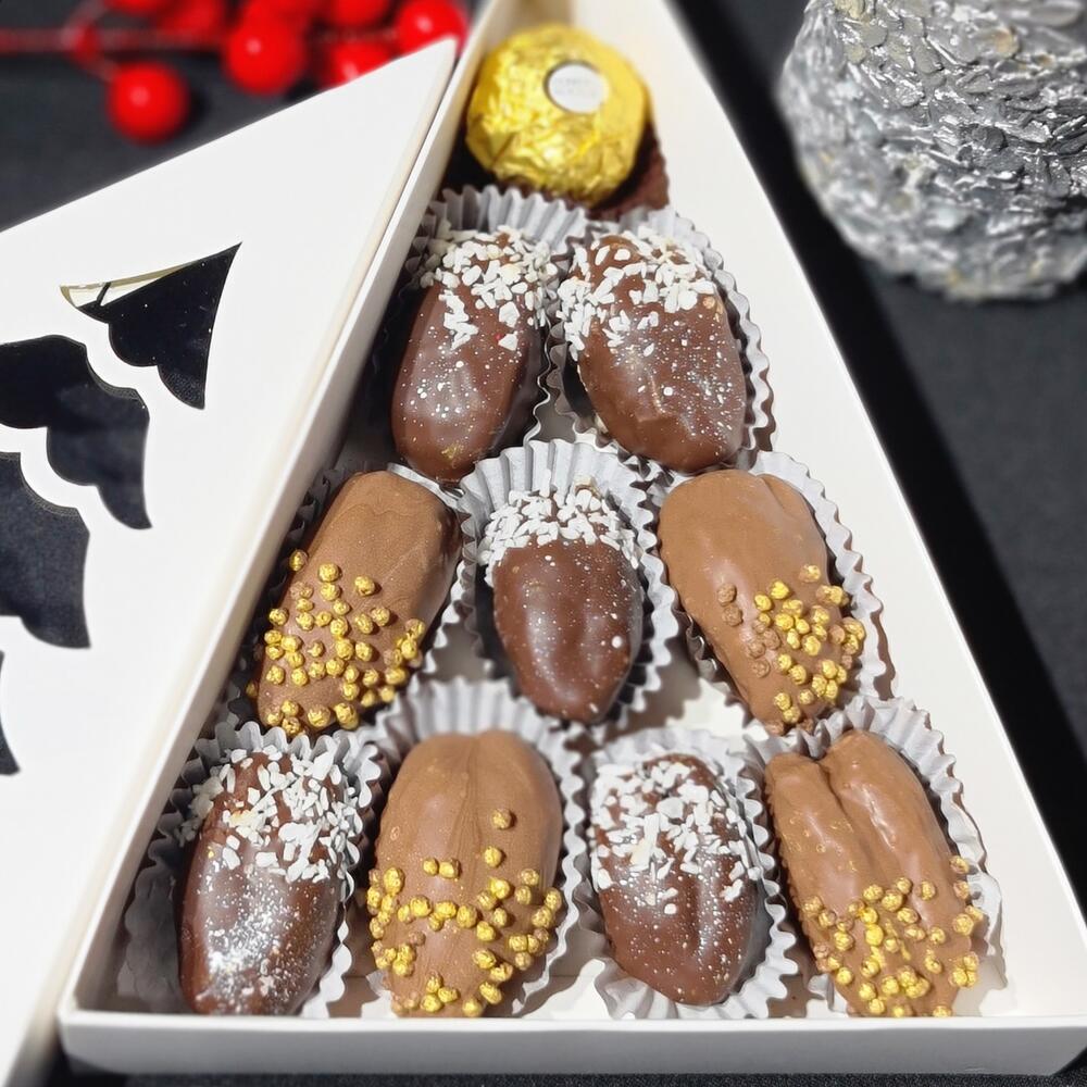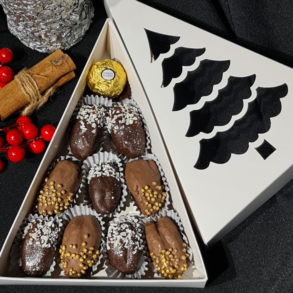 Набор из королевских фиников в бельгийском шоколаде и конфетой Ferrero Roshe ,в коробочке с окном в виде ёлки - станет отличным сюрпризом не только в предновогодний период . Таким набором вы сможете радовать своих близких всю зиму. Открыточка с вашими пожеланиями будет приятным бонусом к заказу.