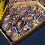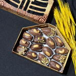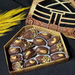 Королевские финики в бельгийском шоколаде с грецким орехом, украшенные дробленой фисташкой кешью и миндалём.