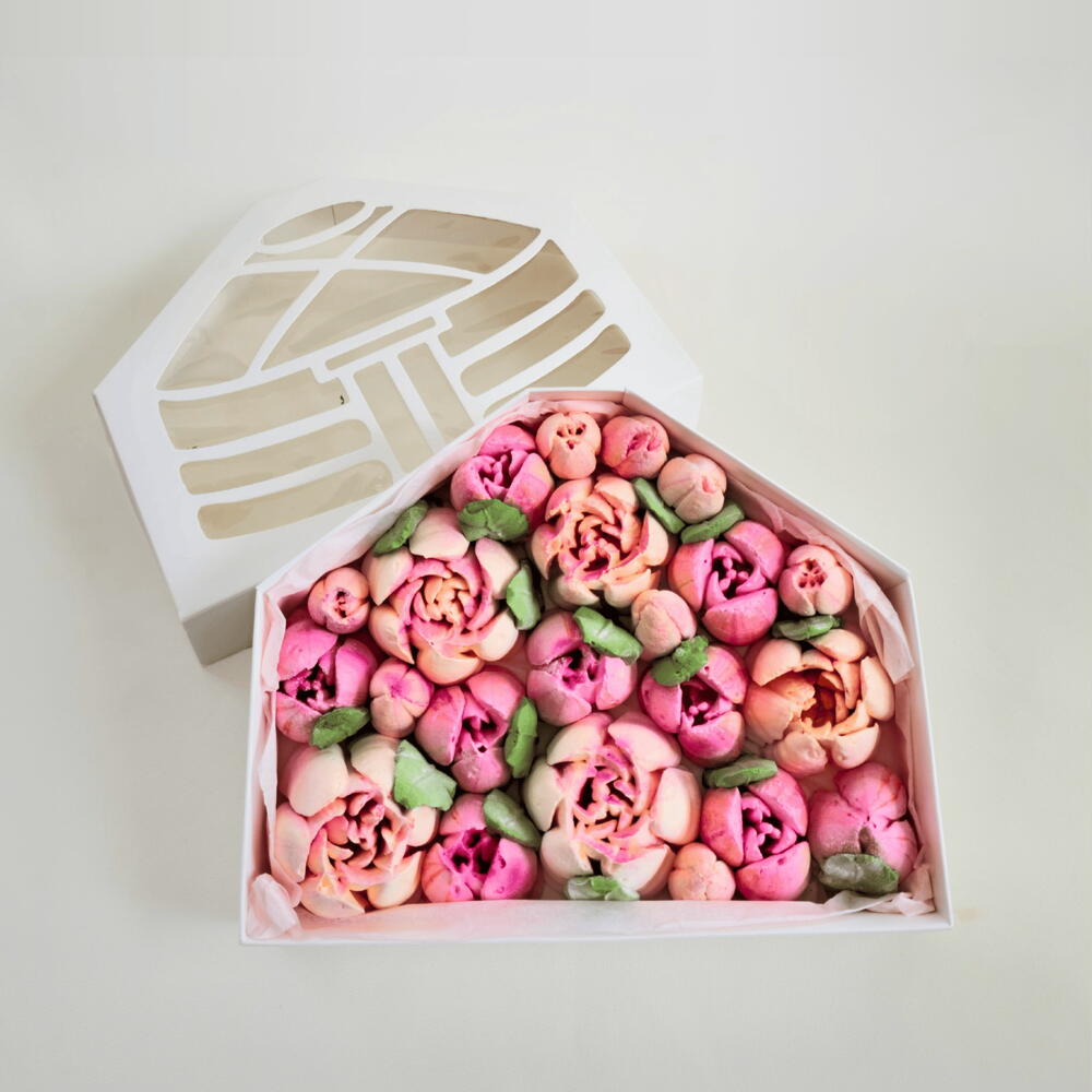 Нежная подарочная коробочка в форме юрты с зефирными тюльпанами — оригинальный и очень тёплый подарок. Внутри аккуратно уложены зефирные цветы ручной работы, выполненные в виде распускающихся тюльпанов в красивых оттенках с зелёными листочками. Каждый цветок отсажен вручную из натурального зефира на основе яблочного пюре. Десерт получается лёгким, воздушным и тающим во рту. Коробочка в форме юрты придаёт подарку особый национальный колорит и делает его запоминающимся — такой подарок одинаково приятно получить и как сладость, и как красивый комплимент. Идеально подойдёт для: - Наурыз • дня рождения • 8 марта и других праздников • подарка маме, подруге или коллеге • тёплого знака внимания без повода Зефир готовится небольшими партиями, поэтому вы получаете свежий, мягкий и ароматный десерт. ✨ Красиво. Натурально. Очень вкусно.