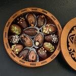 Королевские финики в бельгийском шоколаде с грецким орехом . Украшение крошка миндаля, крошка фисташки, кокосовая стружка.