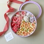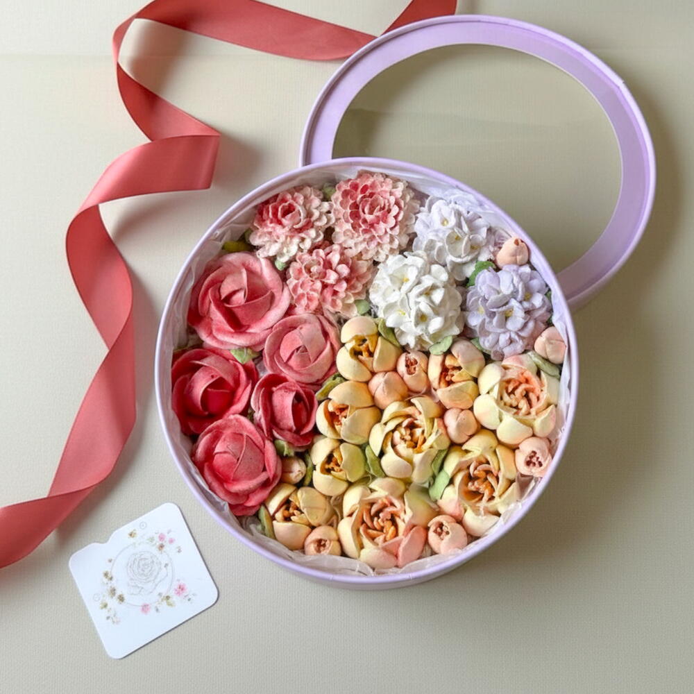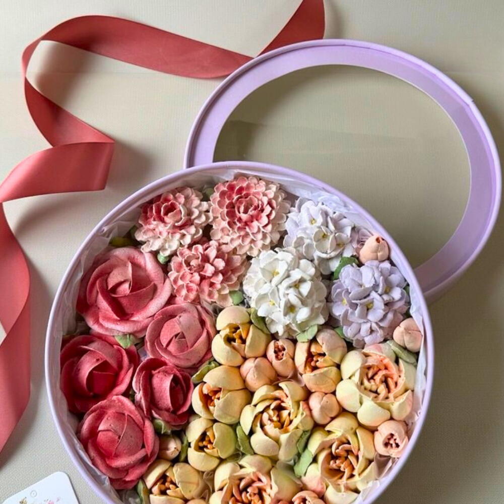 Зефирные цветы MIX в шляпной коробке (Ø 25 см) Нежная композиция из зефирных цветов: тюльпаны, розы, хризантема и гортензия, собранные в стильной круглой шляпной коробке. Каждый цветок выполнен вручную из воздушного зефира с мягкой текстурой и сбалансированной сладостью. Зефир приготовлен на яблочном соке и пюре, только из натуральных ингредиентов — без консервантов и искусственных добавок. Свежий, лёгкий и очень вкусный десерт, который радует не только внешне, но и по-настоящему приятно тает во рту. Идеально подойдёт в качестве подарка или красивого сладкого комплимента