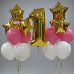 В набор входят розовые и белые латексные шары, дополненные золотыми звёздами и цифрой — эффектное сочетание для первого дня рождения, детского праздника или фотосессии. Создаёт праздничную атмосферу и станет отличным украшением вашего торжества!