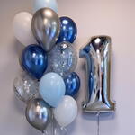 Стильное украшение для праздника! В набор входит большая фольгированная цифра 1 и эффектный фонтан из шаров разных оттенков: серебристого, синего, голубого и белого. Прозрачные шары с конфетти добавляют блеска и торжественности. Идеально подойдёт для первого дня рождения!