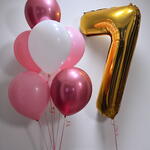 Нежная композиция с фольгированной цифрой 7 и 7 воздушными шарами в розово-белой гамме. Шары разных оттенков розового и белого создают лёгкое и праздничное настроение. Идеально подойдёт для дня рождения девочки, фотосессии или украшения детского праздника. Стильное и яркое оформление для особенного дня! 💖