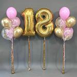 Яркая композиция из фольгированных и латексных шаров для дня рождения. В центре — большие золотые цифры 18 (фольгированные шары), по бокам — букеты из воздушных шаров в золотых, розовых и прозрачных тонах с конфетти внутри. Идеально подходит для фотозоны и праздничного декора на 18-летие. В комплект входит: • 2 фольгированных шара-цифры (1 и 8, золото, размер — около 80 см) • 8 латексных шаров (розовые, золотые, прозрачные с конфетти) • Ленты и грузы для фиксации Подойдет для: • Украшения зала, фотозоны, дома или кафе • Именин, юбилеев, вечеринок